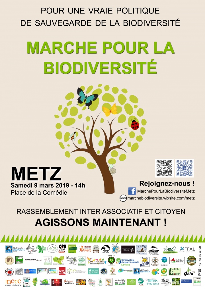 « Le 9 mars 2019 à Metz, la LPO Moselle vous encourage à se joindre à elle pour marcher pacifiquement en faveur de la préservation de notre biodiversité. L’idée de cette Marche a été lancée aux associations en mai 2018 par Victor NOEL, 14 ans, passionné de Nature, et inquiet de l’état de la biodiversité et de l’inaction du gouvernement. La LPO Moselle a accepté d’en être le pilote.