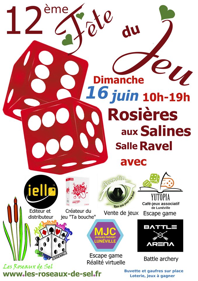 Le club de jeux « Jouons ensemble » de l’association Les Roseaux de Sel de Rosières aux Salines organise la 12ème édition de la Fête du jeu le dimanche 16 juin 2019 de 10h à 19h, salle du Ravel.