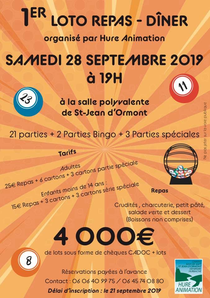 L’association HURE ANIMATION organise son 1er loto repas le samedi 28 septembre 2019 à 19h à la salle polyvalente de Saint Jean d’Ormont.