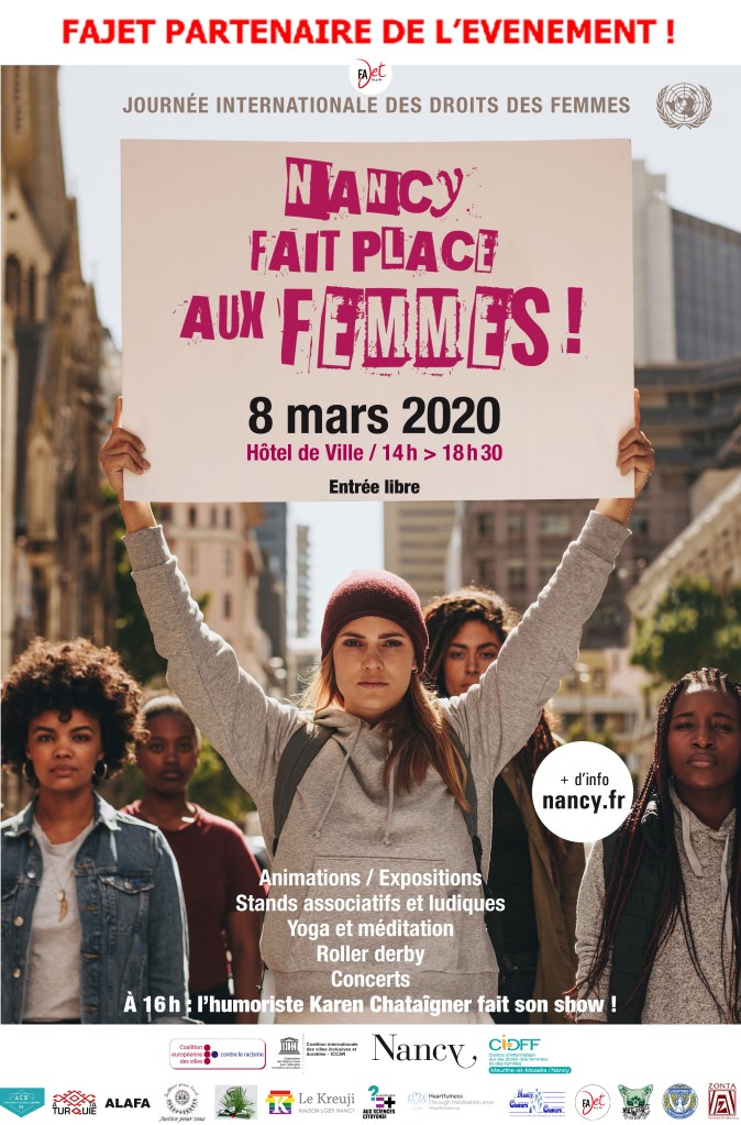 La Journée internationale des droits des femmes est célébrée chaque 8 mars, à l’échelle mondiale. C’est l’occasion pour la Ville de Nancy de revendiquer à nouveau l’égalité hommes-femmes et de se mobiliser en créant l’événement à l’Hôtel de Ville. ET FAJET EST PARTENAIRE !