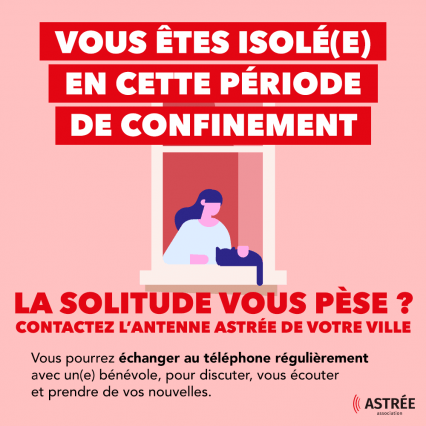 Astrée, association nationale reconnue d’utilité publique, lutte depuis plus de 30 ans contre l’isolement grâce à un réseau de bénévoles formés à l’écoute et l’accompagnement. Chacun des bénévoles accompagne en face à face de façon personnalisée, hebdomadaire et dans la durée ceux qui sont seuls.