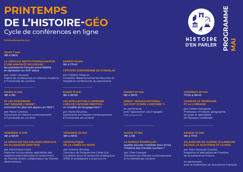 L’association Histoire d’en Parler vous propose jusque fin juin un cycle de conférences en ligne : Printemps de l’Histoire Géo.