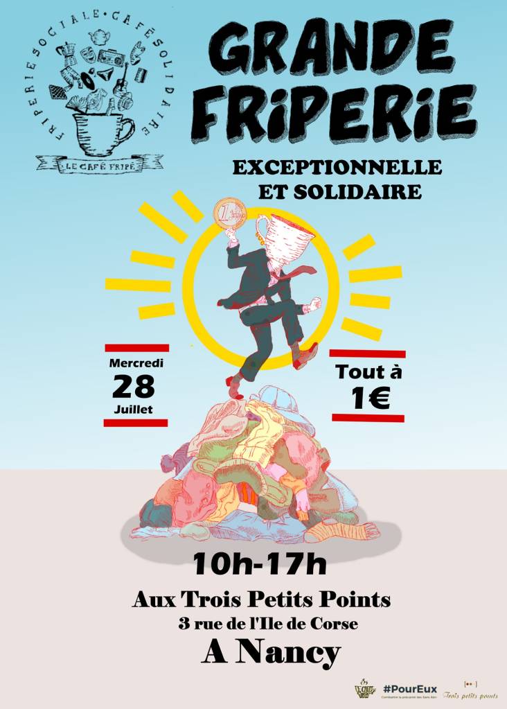 L’association Le Café Fripé vous invite à sa grande friperie exceptionnelle et solidaire le 28 juillet de 10h à 17h aux Trois Petits Points, 3 rue de l’Ile-de-Corse à Nancy.