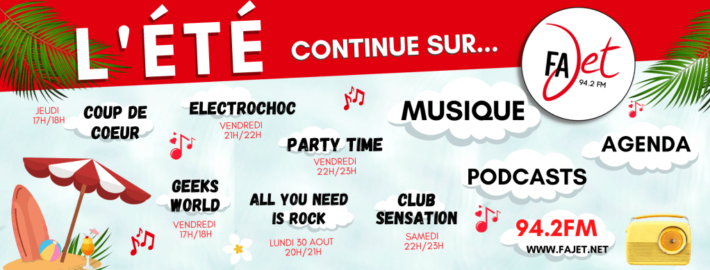 L’été continue sur Fajet Par radiofajet le 30/07/2021 Retrouvez toutes les émissions de l’été sur le 94.2 FM ou en podcast juste ici ! Partager : Partager sur Facebook(ouvre dans une nouvelle fenêtre) Facebook Partager sur LinkedIn(ouvre dans une nouvelle fenêtre) LinkedIn Partager sur WhatsApp(ouvre dans une nouvelle fenêtre) WhatsApp Partager sur X(ouvre dans une nouvelle fenêtre) X Partager sur Telegram(ouvre dans une nouvelle fenêtre) Telegram Partager sur Threads(ouvre dans une nouvelle fenêtre) Threads Partager sur Mastodon(ouvre dans une nouvelle fenêtre) Mastodon Partager sur Bluesky(ouvre dans une nouvelle fenêtre) Bluesky J’aime chargement… Articles similaires Catégories :Non classé