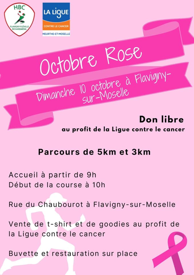 Dans le cadre de « L’octobre Rose » le Handball Club Flavigny Fléville Richardménil vous invite à participer à une course de 3 et/ou 5 km pour récolter des fonds pour la ligue contre le cancer du sein le dimanche 10 Octobre 2021 au Parc du Chaubourot à Flavigny sur Moselle à partir de 10h.