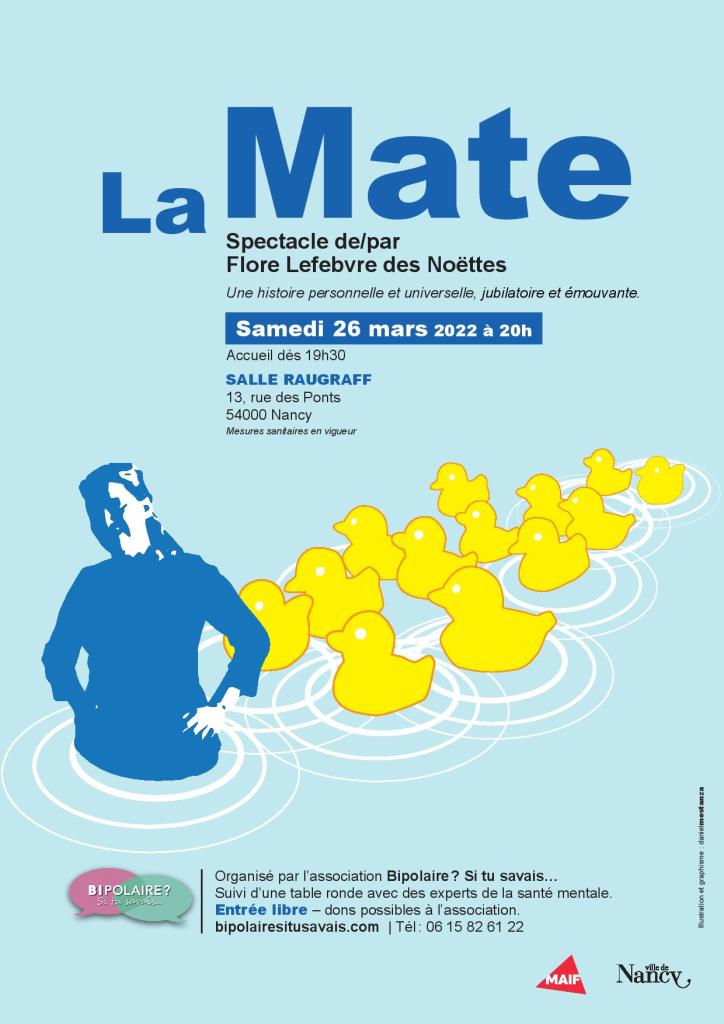 A l’occasion de la journée mondiale des troubles bipolaires, l’association Bipolaire ? Si tu savais… vous invite à la représentation de LA MATE, un spectacle de et par Flore Lefebvre des Noëttes, Une histoire personnelle et universelle, jubilatoire et émouvante, le samedi 26 mars 2022 à 20h ( Accueil dès 19h30 – Salle Raugraff – 13 rue des Ponts – Nancy).