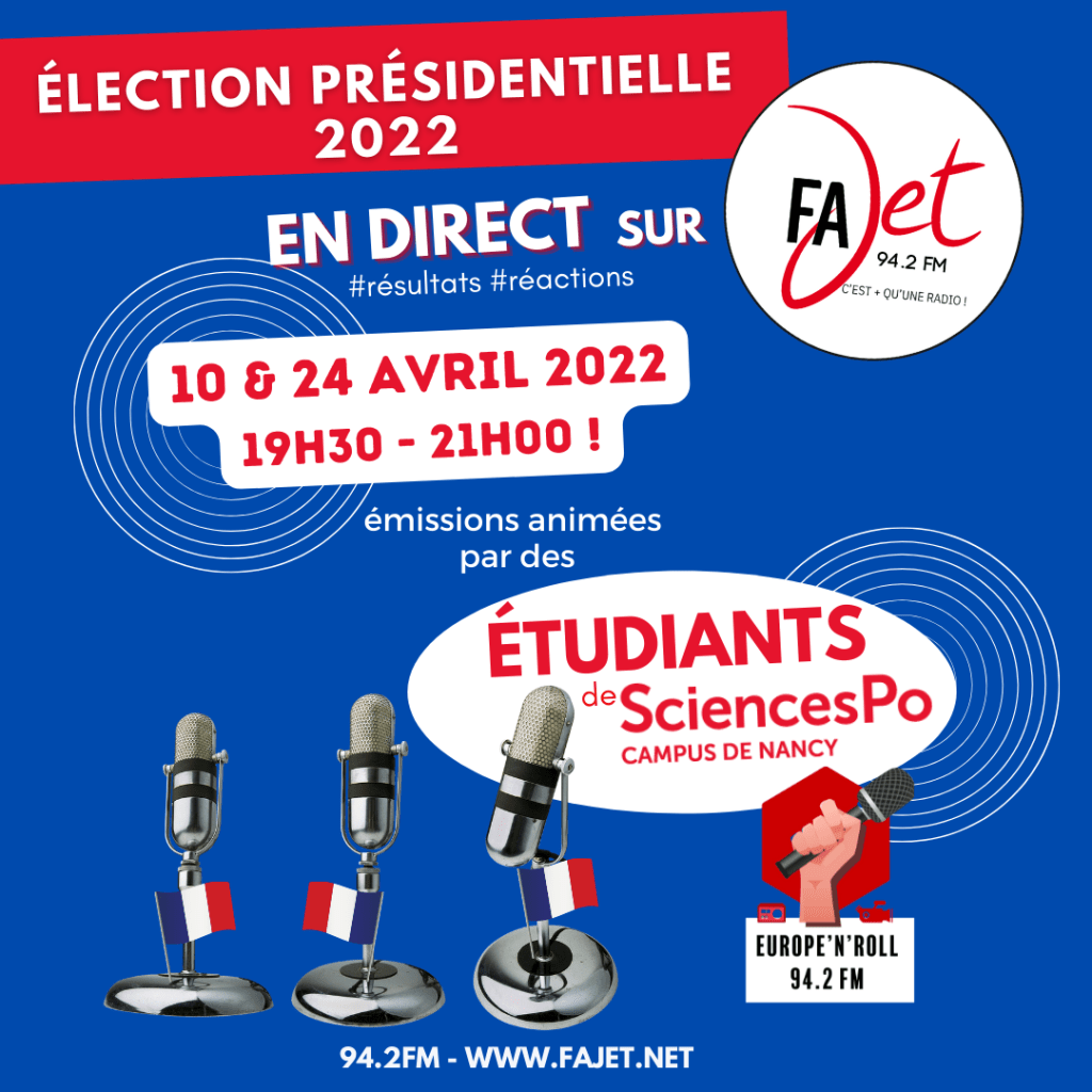 Les 10 et 24 avril 2022, des étudiants du Campus Sciences Po Nancy organisent sur FAJET, 2 émissions spéciales à l’occasion des résultats de l’élection présidentielle.