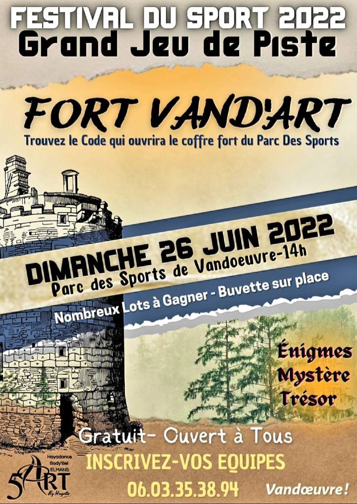 Dimanche à partir de 14h00, FORT VAND’ART ; un Grand jeux de piste ouvert à tous dans toute la ville de Vandoeuvre. Une après-midi pleine d’énigmes, de mystères et de trésors avec un parcours adapté aux personnes en fauteuil.