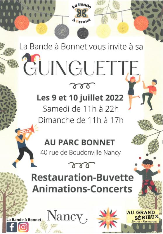 Après une 1ère édition en juillet 2021 et une 2ème en décembre 2021, l’association « La Bande à Bonnet » vous invite de nouveau ce week-end, 9 et 10 juillet 2022, pour sa guinguette : un programme varié vous attend, pour passer un moment festif et convivial au parc Bonnet !