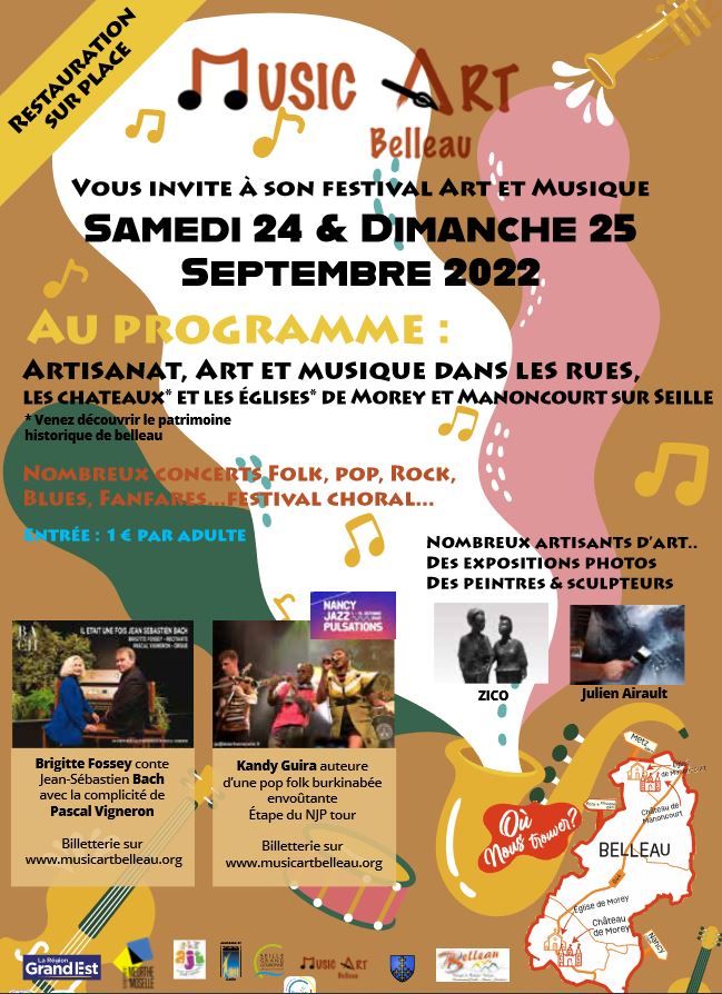Sous l’impulsion de Music Art Belleau, le premier festival des métiers d’art, de l’artisanat et de la musique aura lieu les 24 et 25 septembre 2022 sur le territoire de Belleau en Meurthe-et-Moselle. Il se déroulera dans les rues, les châteaux et églises de Manoncourt-sur-Seille et Morey du samedi après-midi au dimanche fin d’après-midi.