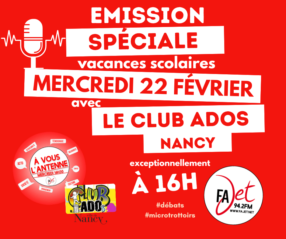 featured A VOUS L’ANTENNE avec le Club Ados de Nancy Par radiofajet le 20/02/2023 RDV mercredi 22 février avec 10 jeunes du Club Ados de la ville de Nancy pour presque 1h d’émission, autour de sujets d’actualité, de société et plein d’autres choses… Partager : Partager sur Facebook(ouvre dans une nouvelle fenêtre) Facebook Partager sur LinkedIn(ouvre dans une nouvelle fenêtre) LinkedIn Partager sur WhatsApp(ouvre dans une nouvelle fenêtre) WhatsApp Partager sur X(ouvre dans une nouvelle fenêtre) X Partager sur Telegram(ouvre dans une nouvelle fenêtre) Telegram Partager sur Threads(ouvre dans une nouvelle fenêtre) Threads Partager sur Mastodon(ouvre dans une nouvelle fenêtre) Mastodon Partager sur Bluesky(ouvre dans une nouvelle fenêtre) Bluesky J’aime chargement… Articles similaires Catégories :featured