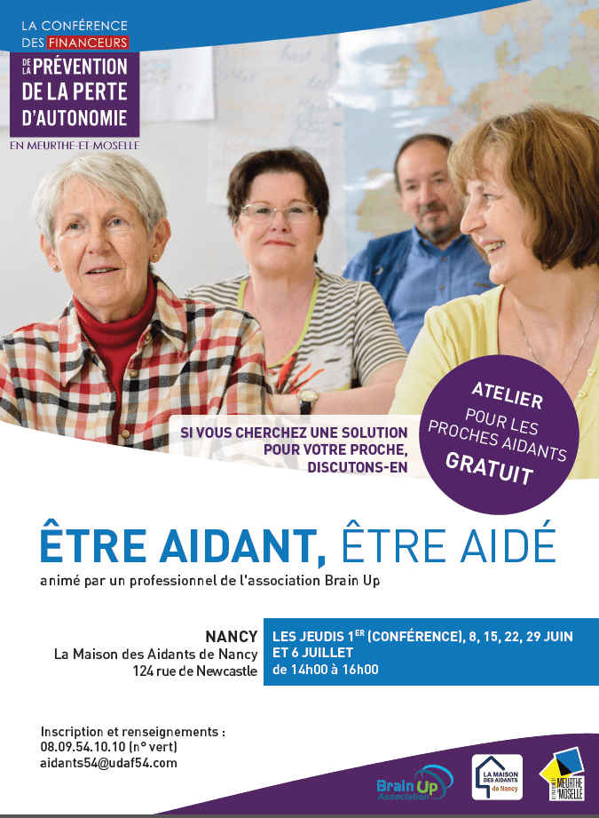 En partenariat avec l’association Brain Up, La Maison des Aidants de Nancy propose, à partir de Juin, un programme de 6 séances intitulé « Etre aidant, être aidé », à destination de tout aidant dont l’aidé est âgé de 60 ans et +.