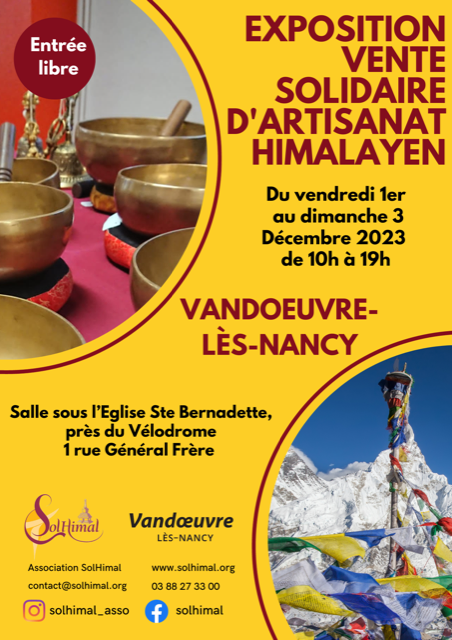 Du 1er au 3 décembre 2023, l’association Solhimal organise une Exposition-vente d’artisanat himalayen à Vandoeuvre-Lès-Nancy.