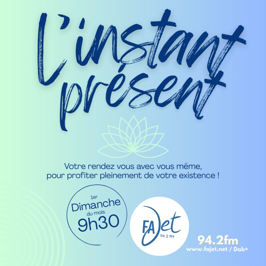 L’instant présent, votre émission et votre rendez vous avec vous même, pour profiter pleinement de votre existence, alors rendez-vous le premier dimanche du mois à 9h30 sur radio Fajet ».