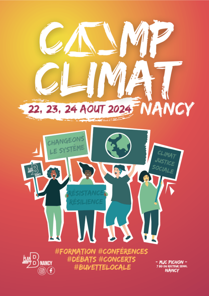 Ce Camp Climat Nancy 2024 se veut un évènement de rencontre, de partage et de coopération. Climat, biodiversité, démocratie, solidarité, lutte sociale, gestion de l’eau, publicité, économie locale, numérique, déchets, vélo… Il y’en a pour tous les goûts pour toutes les sensibilités.