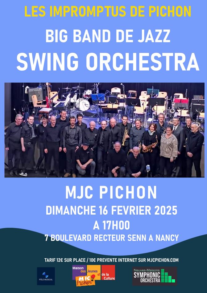 Le samedi 16 février à 17h, la MJC Pichon accueille le Swing Orchestra, un big band de jazz qui fera vibrer le public lors d’un concert exceptionnel, organisé dans le cadre des Impromptus de Pichon.