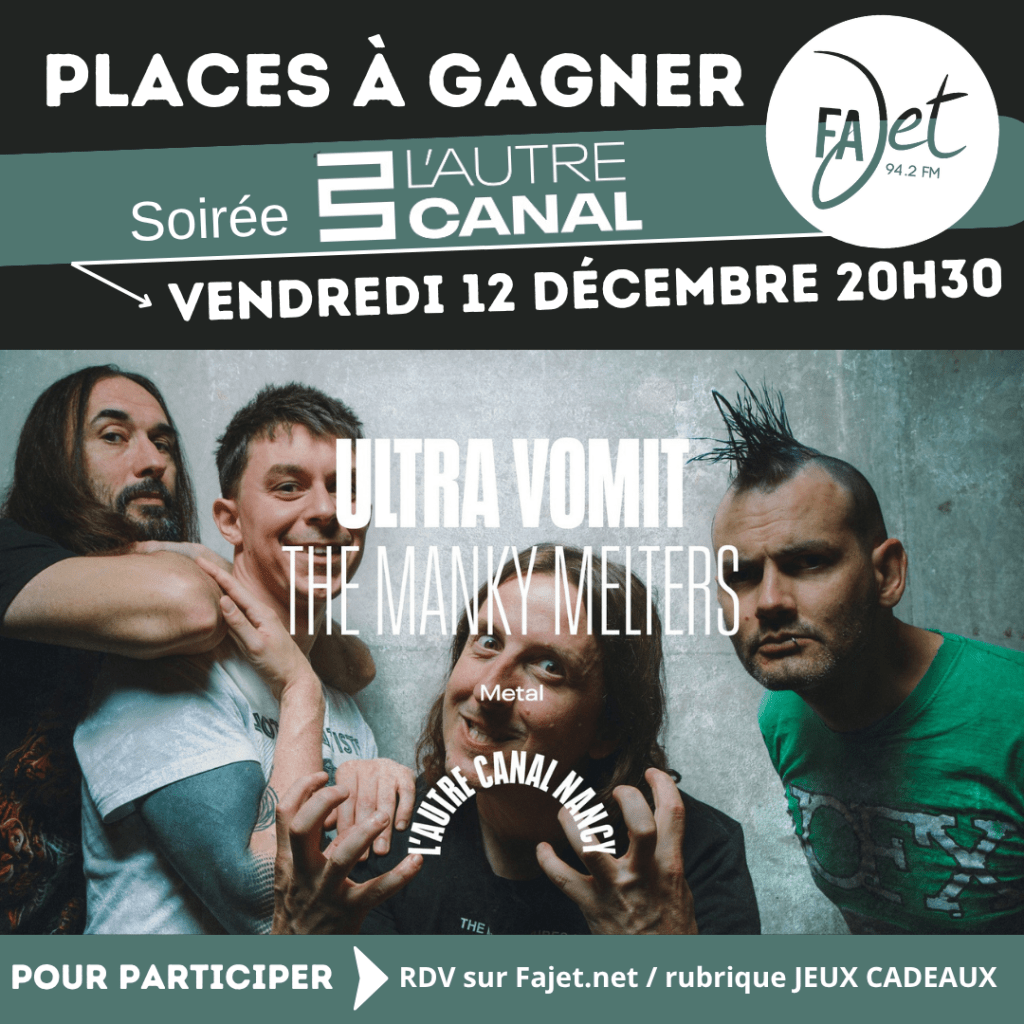 Le vendredi 12 décembre à 20h30 aura lieu la soirée concert Ultra Vomit (avec The Manky Melter en première partie) à L’Autre Canal.