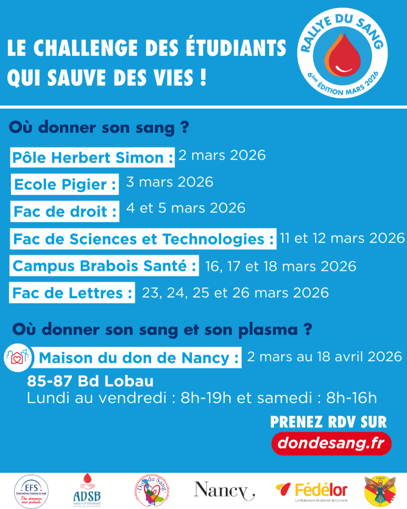 Plus d’infos à l’adresse : https://factuel.univ-lorraine.fr/article/rallye-du-sang-2026-a-nancy-une-heure-pour-faire-la-difference/